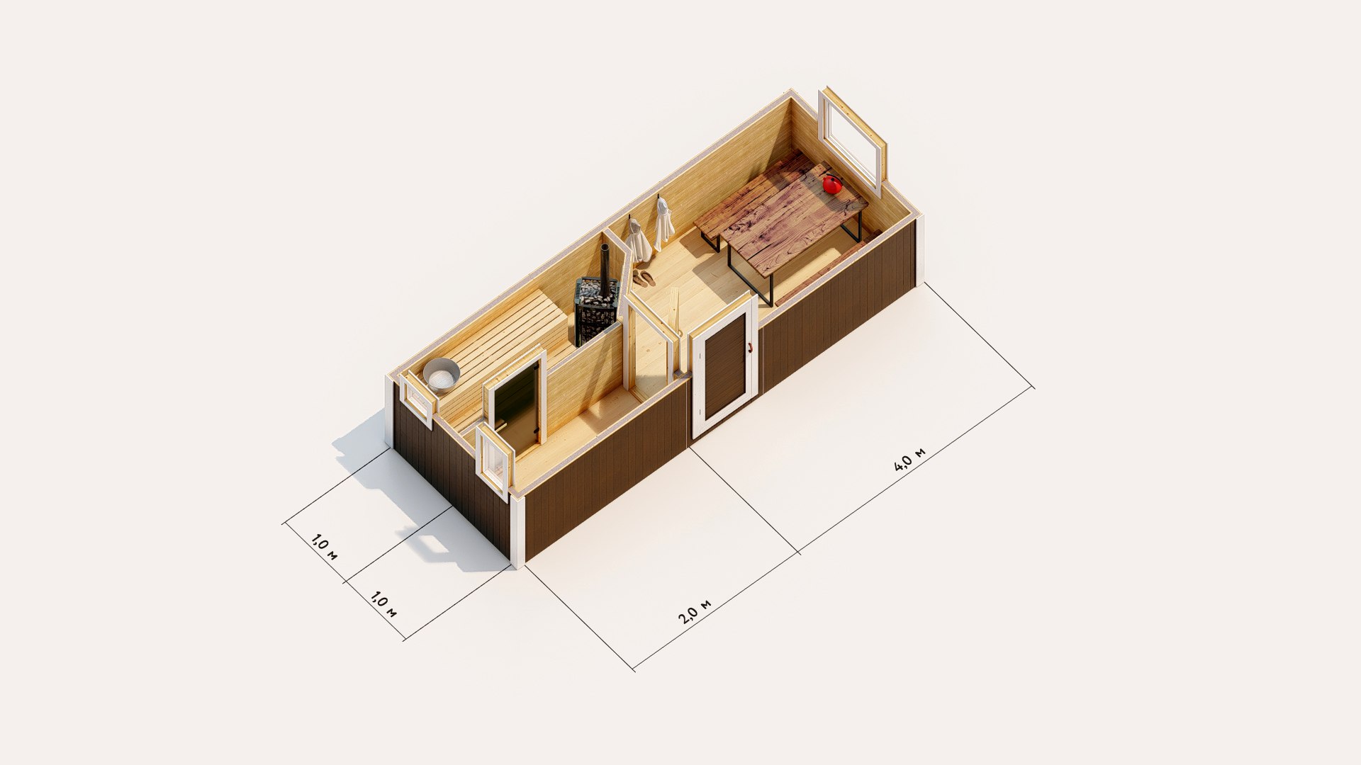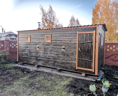 Компактный и практичный вариант, подходит как для дачного участка, так и для временных вахтовых поселков. Состоит из двух секций: парной 4 м² и комнаты отдыха 4 м²